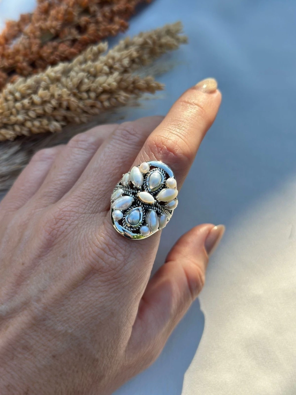 Anel de prata com pérolas mabe, cheio de detalhes em um design único