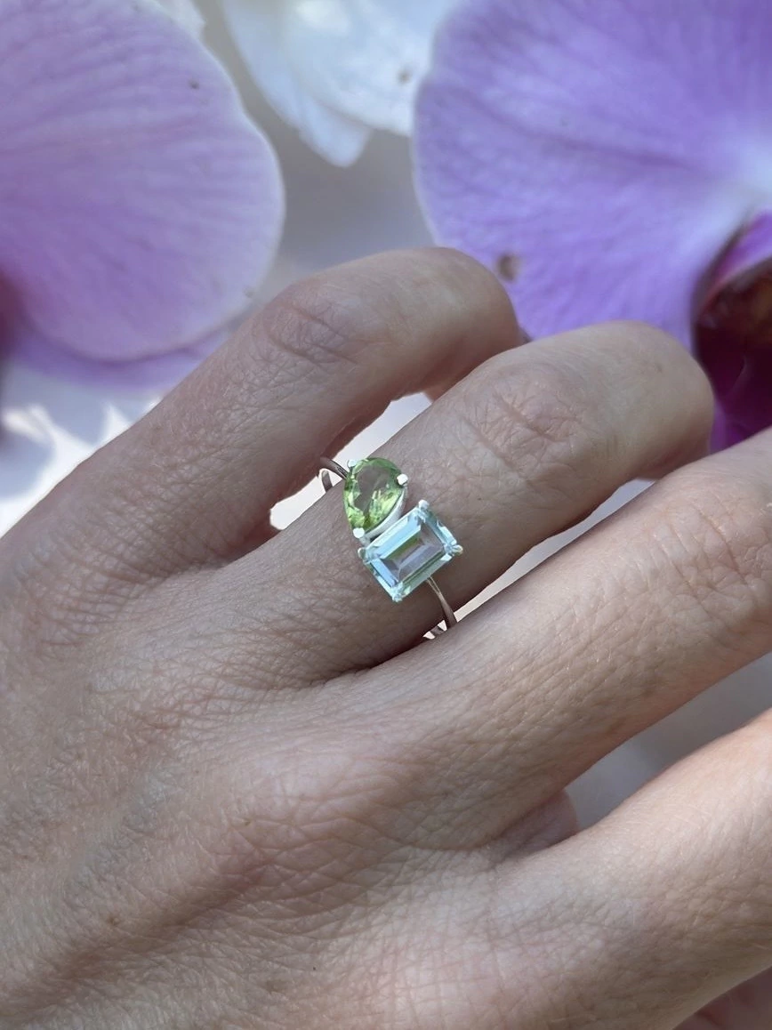 Anel com 2 pedras lapidadas, com linda combinação de cores e muito brilho que só as gemas naturais podem trazer!