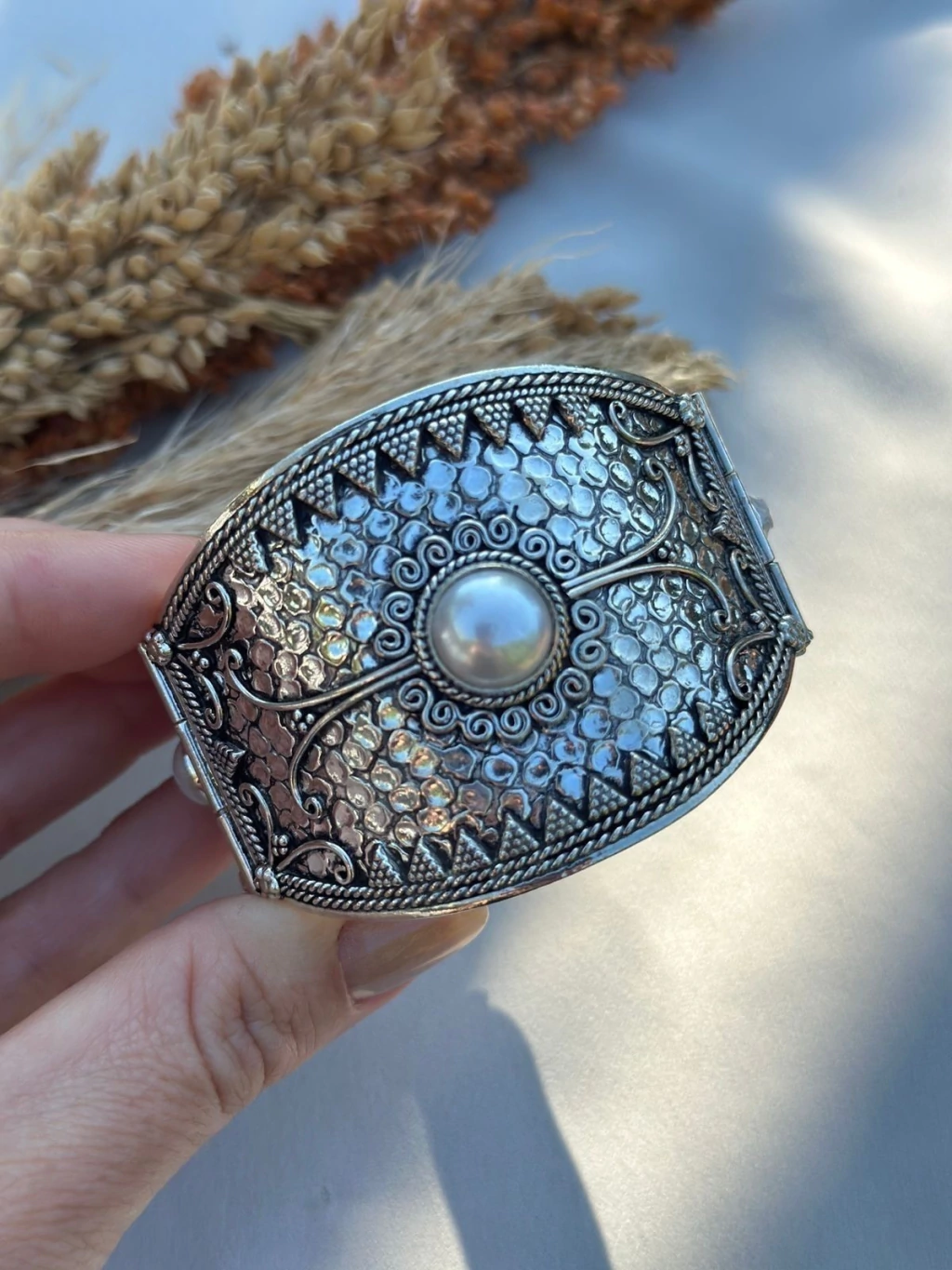 Bracelete de prata envelhecida com pérolas mabe, todo trabalho com deenhos feito a mão.