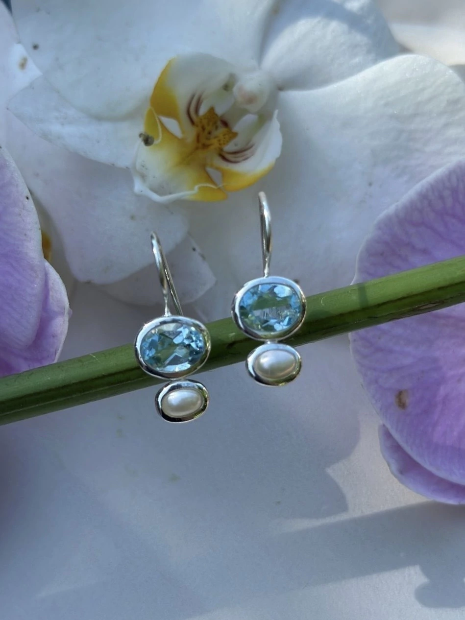 Brinco de Topázio Azul facetado com pérola em baixo - produzido na prata lisa. Brinco de gancho fixo, com cravação inglesa (sem garras)