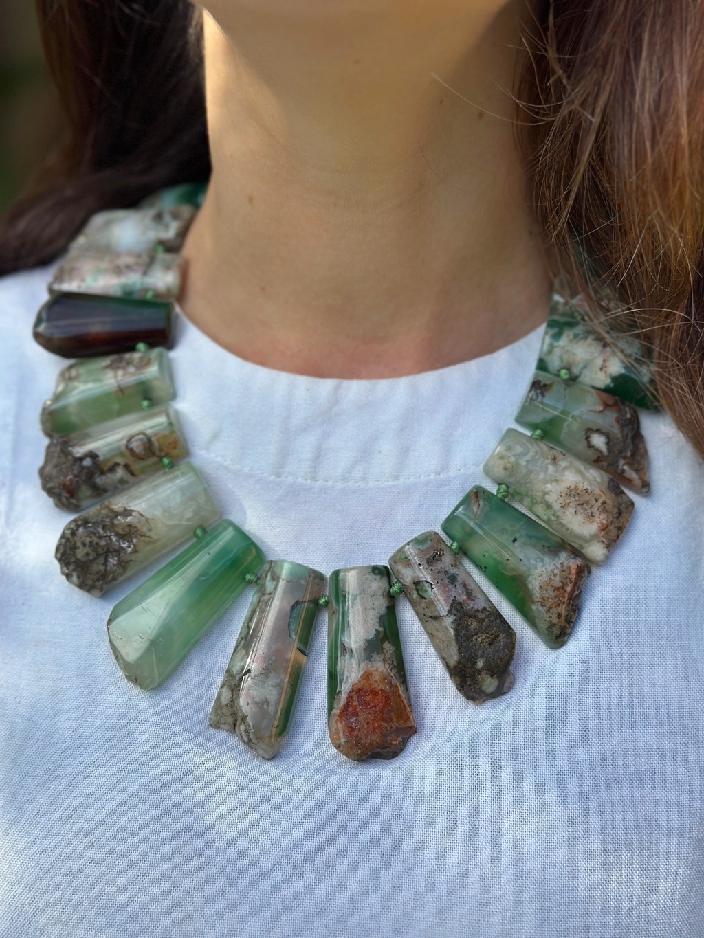 Maxi colar de Agata Verde, a pedra é cortada em chapas retangulares, polidas na superfície e com bordas rústicas. Possui nó entre as pedras para maior segurança, e está montado em degradê. É um colar robusto e pesado.