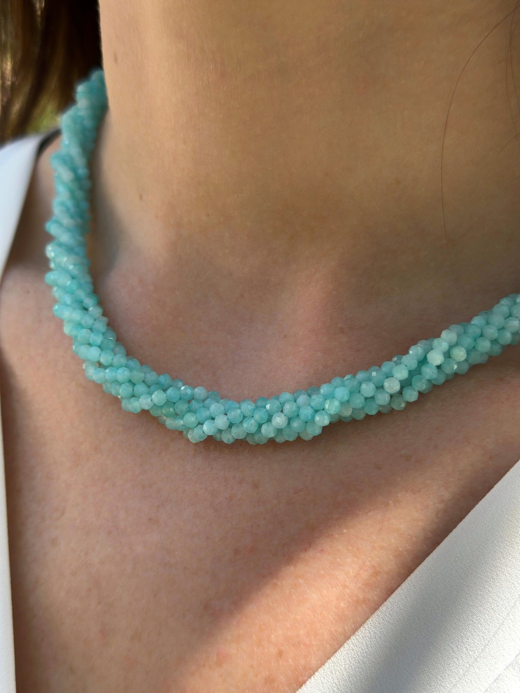 Colar com várias voltas, tipo torsade de pedra Amazonita. Pedrinhas são facetadas e possui fecho infinito