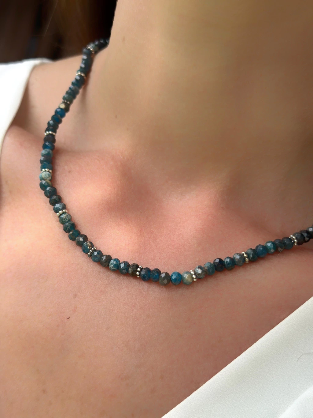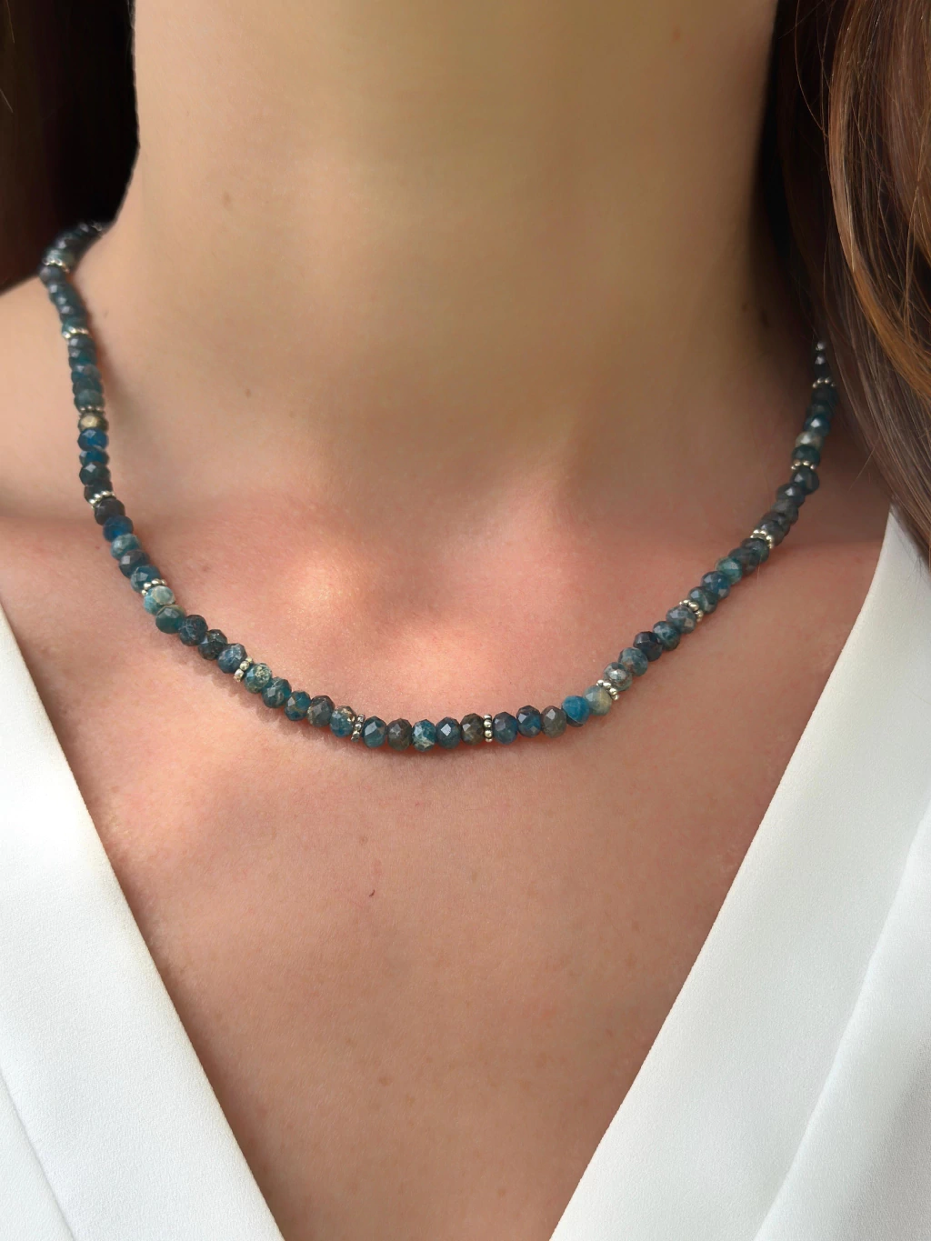 Colar de Azurita com prata no intermeios. Pedrinhas são facetadas com 5 mm cada e fecho de prata