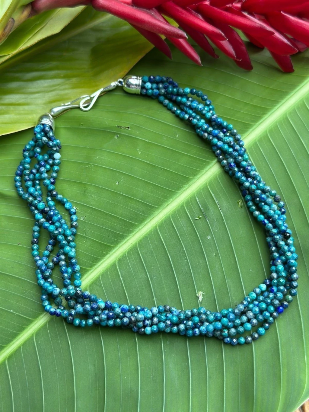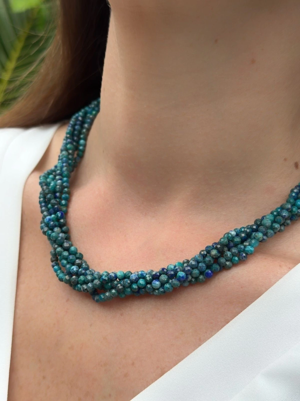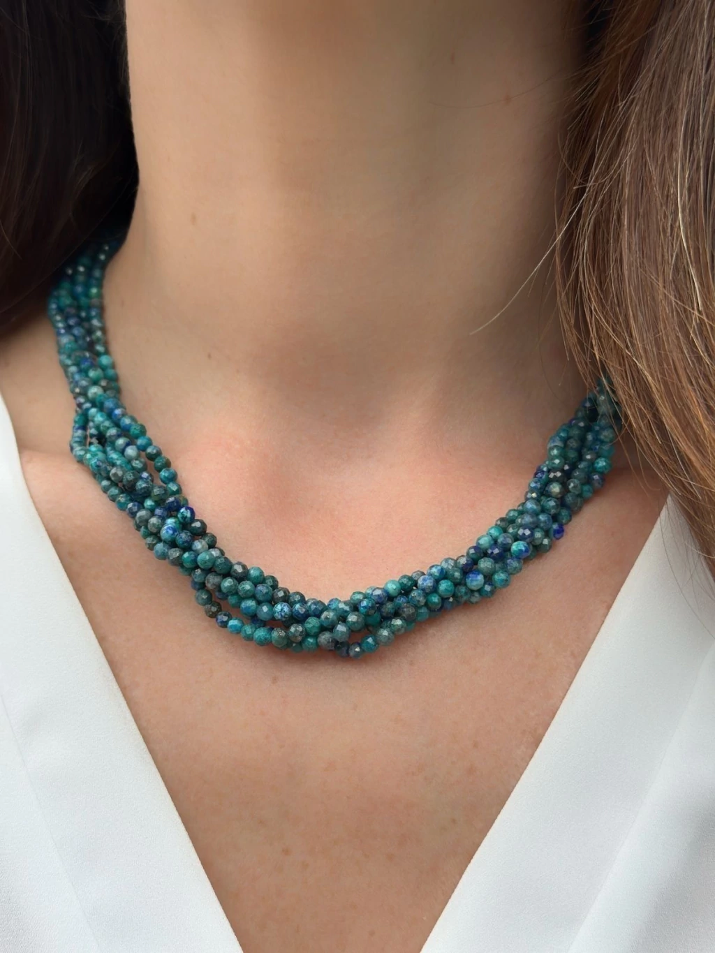 Colar com 6 voltas, tipo torsade de pedra Azurita. Pedrinhas são facetadas com 3.5 mm cada e fecho infinito