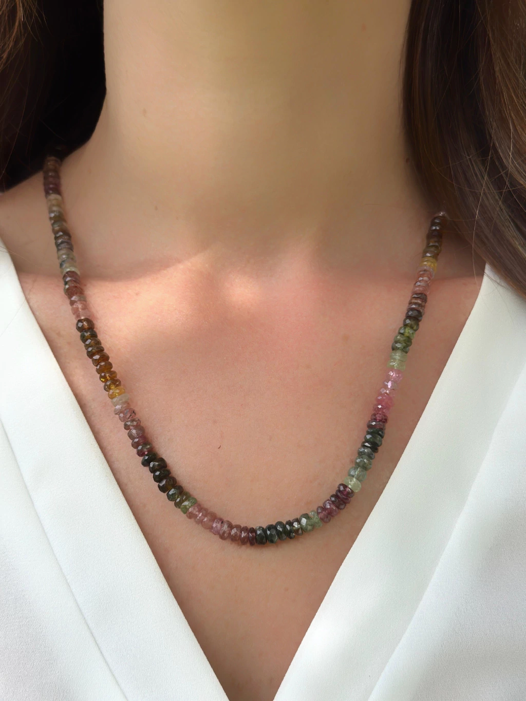 Colar de Turmalina facetada em rondel com fecho de Prata 925. Esse colar possui uma pequena amostra da rica diversidade de tons da gema turmalina