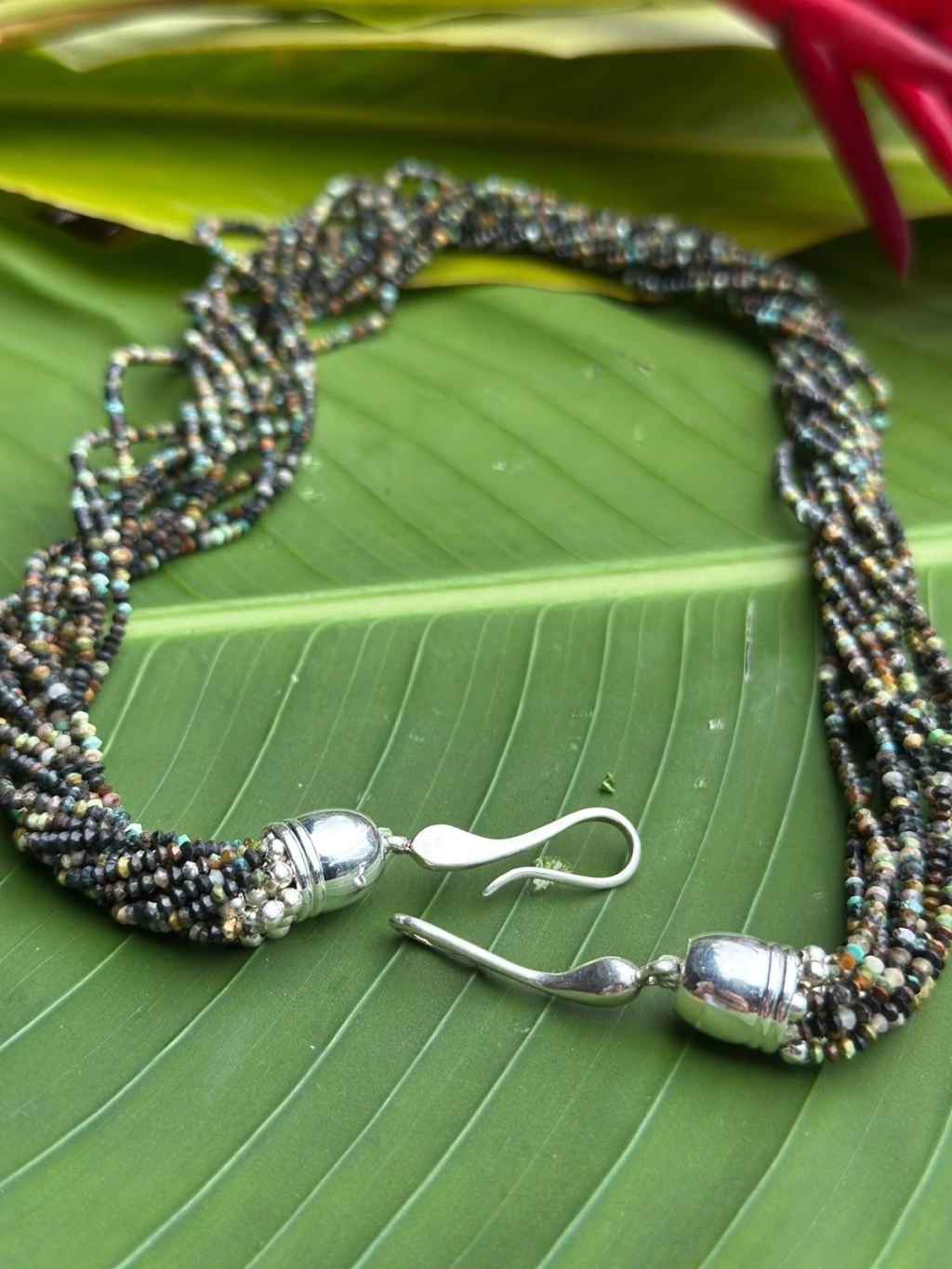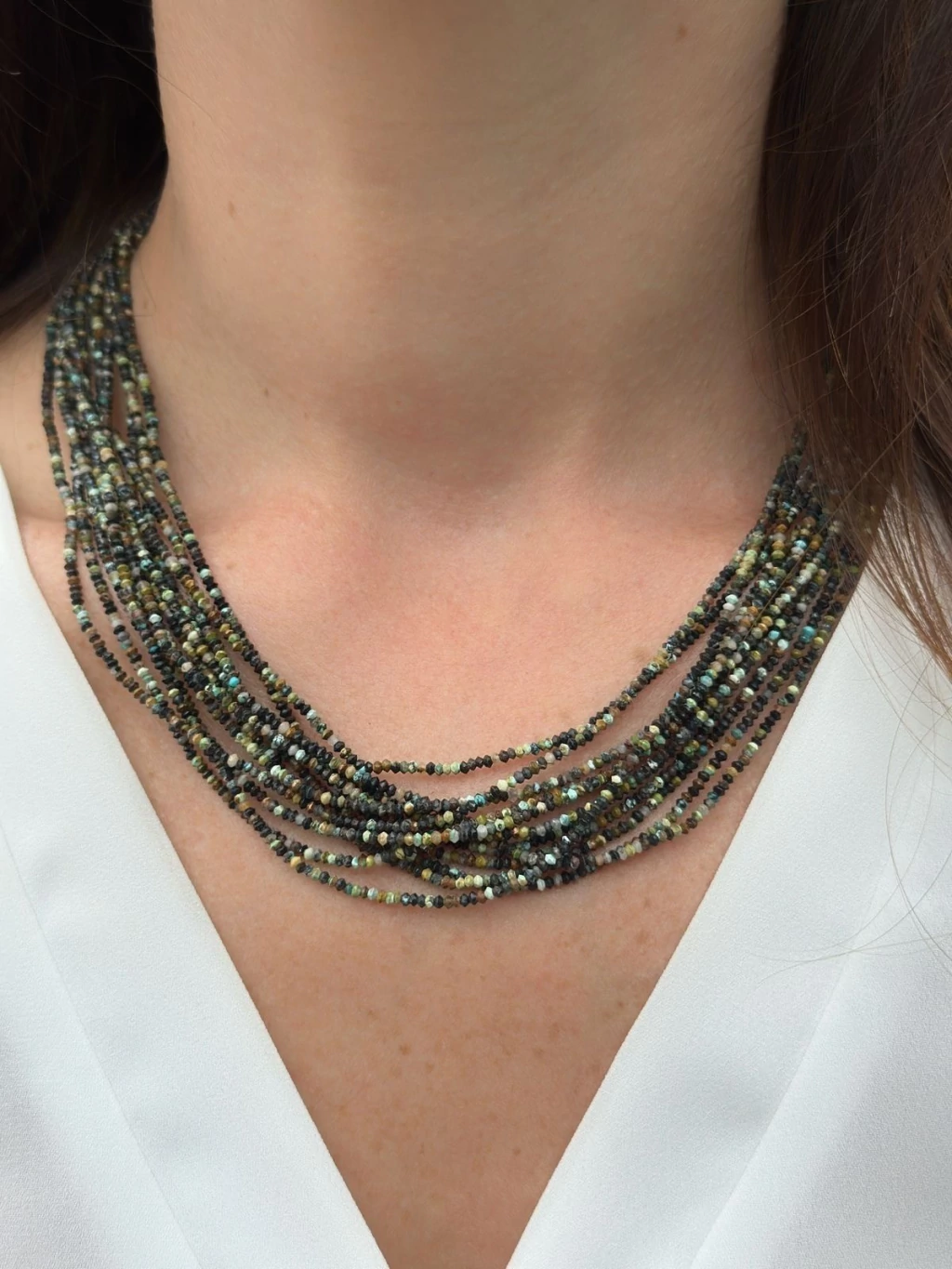Colar com 12 fios de Turquesa com fecho infinito em banho de prata. Cada pedrinha mede 2mm, possui lapidação em rondell