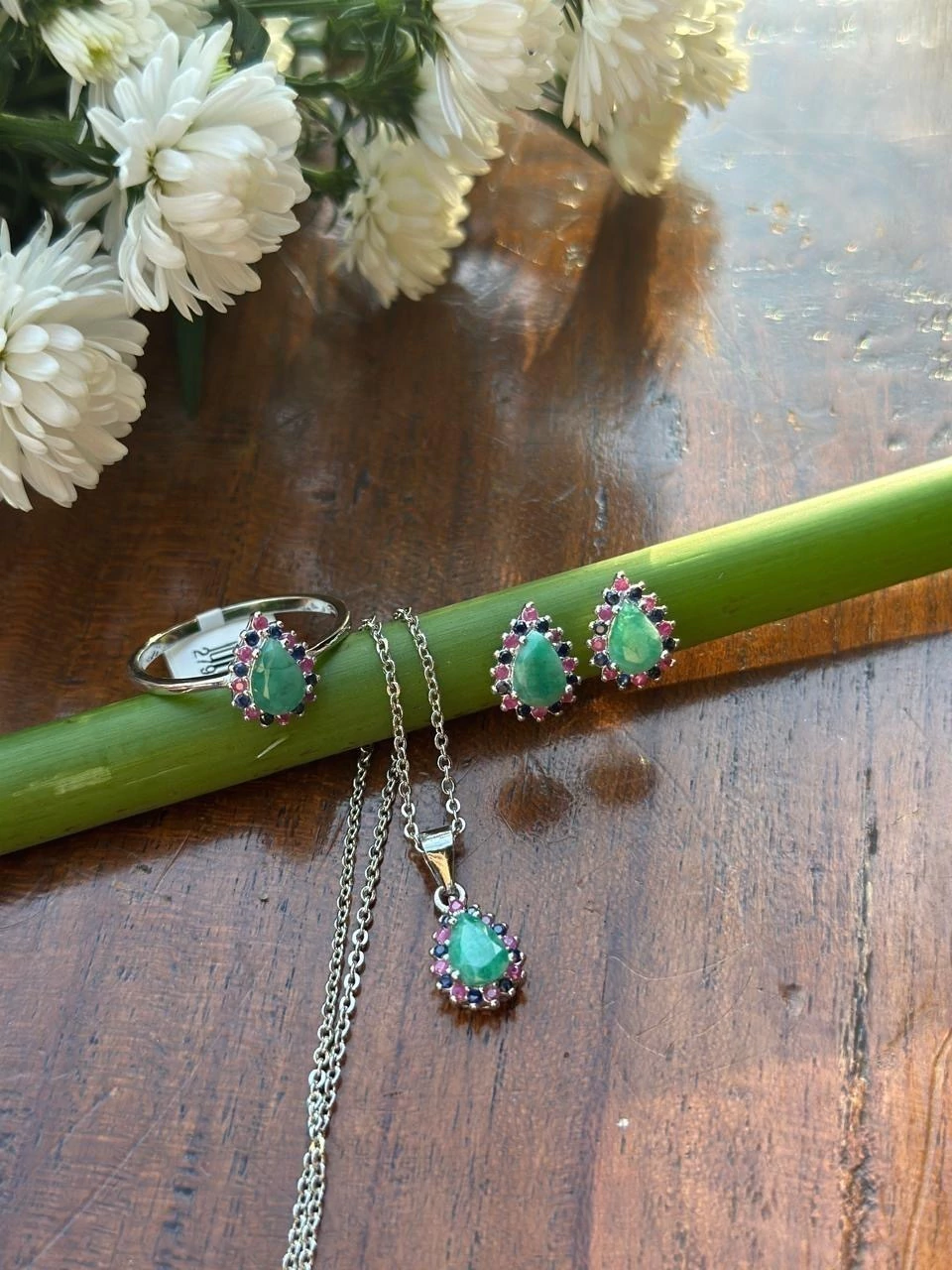 Conjunto de Esmeralda- uma excelente opção de presente! Conjunto completo e encantador de pedra lapidade central de esmeralda com mini pedrinhas lapidadas no contorno em formato de gota.