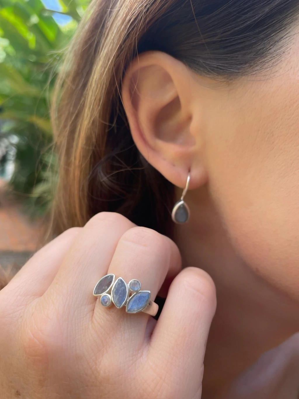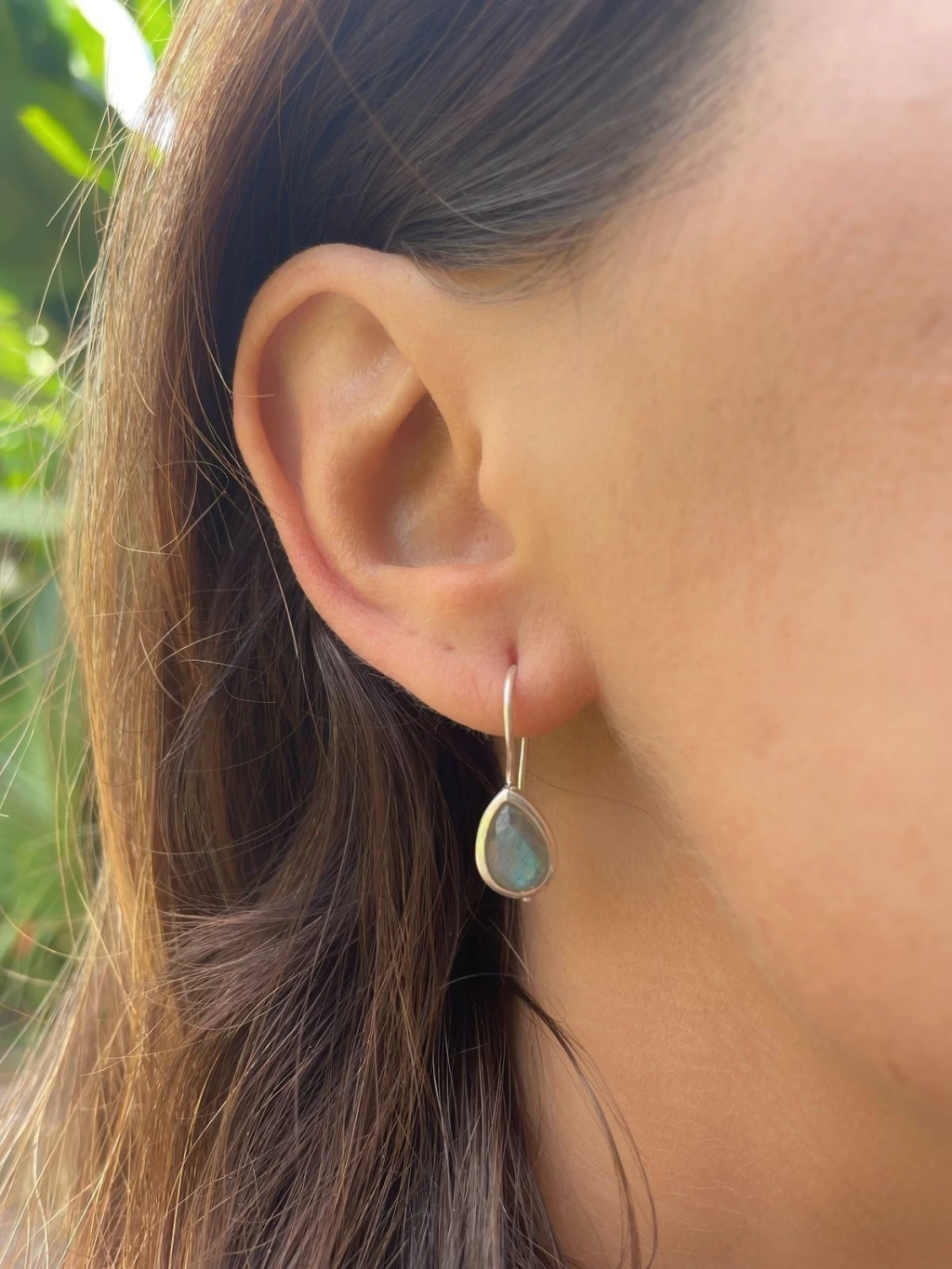 Conjunto de Labradorita facetada com prata lisa. Brinco de gancho fixo.