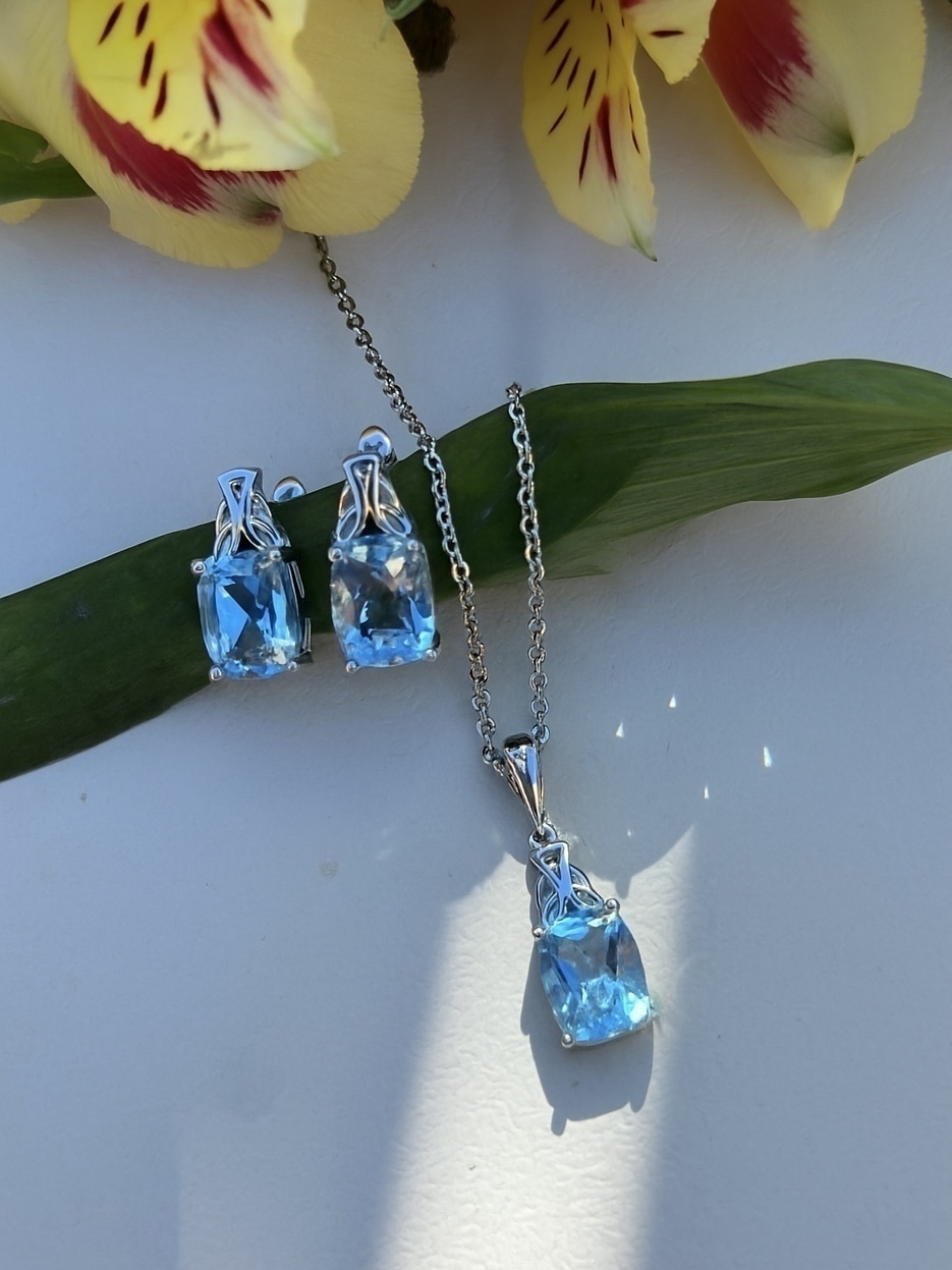 Esse conjunto é composto por brinco e pingente de pedras de topazio azul lapidado com acabamento de prata 925 + ródio. Acompanho tambem a corrente.