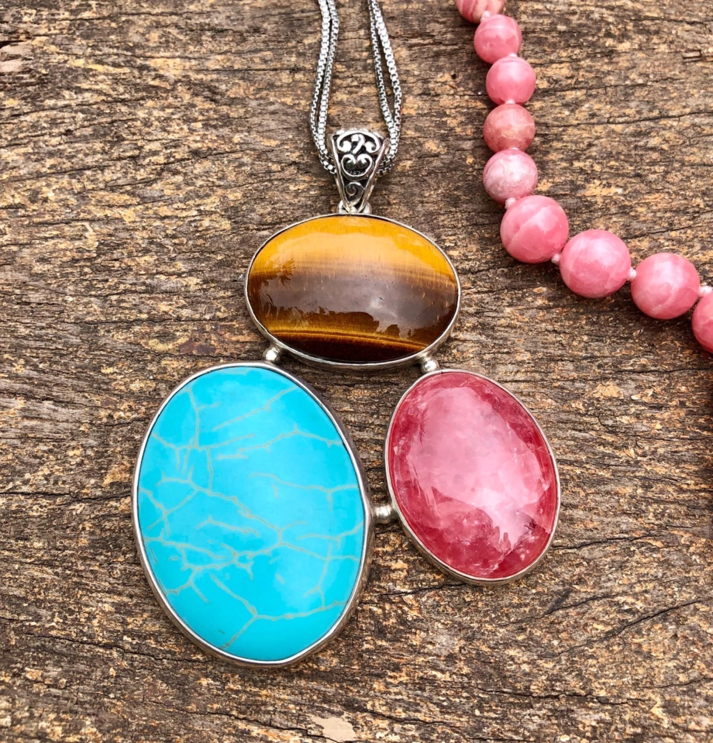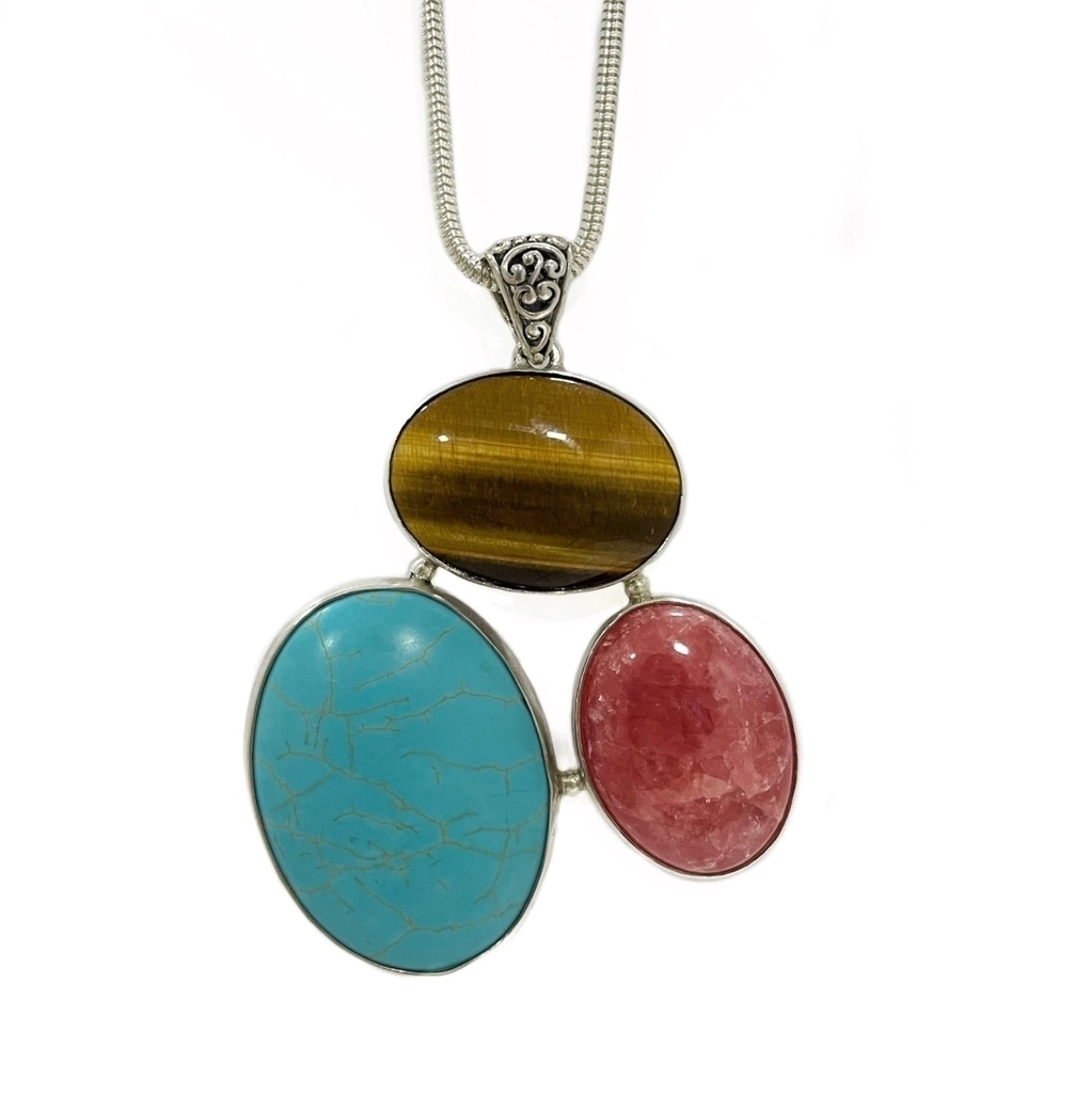 Pingente de Olho de Tigre, Rodocrosita e Turquesa com Prata 925.