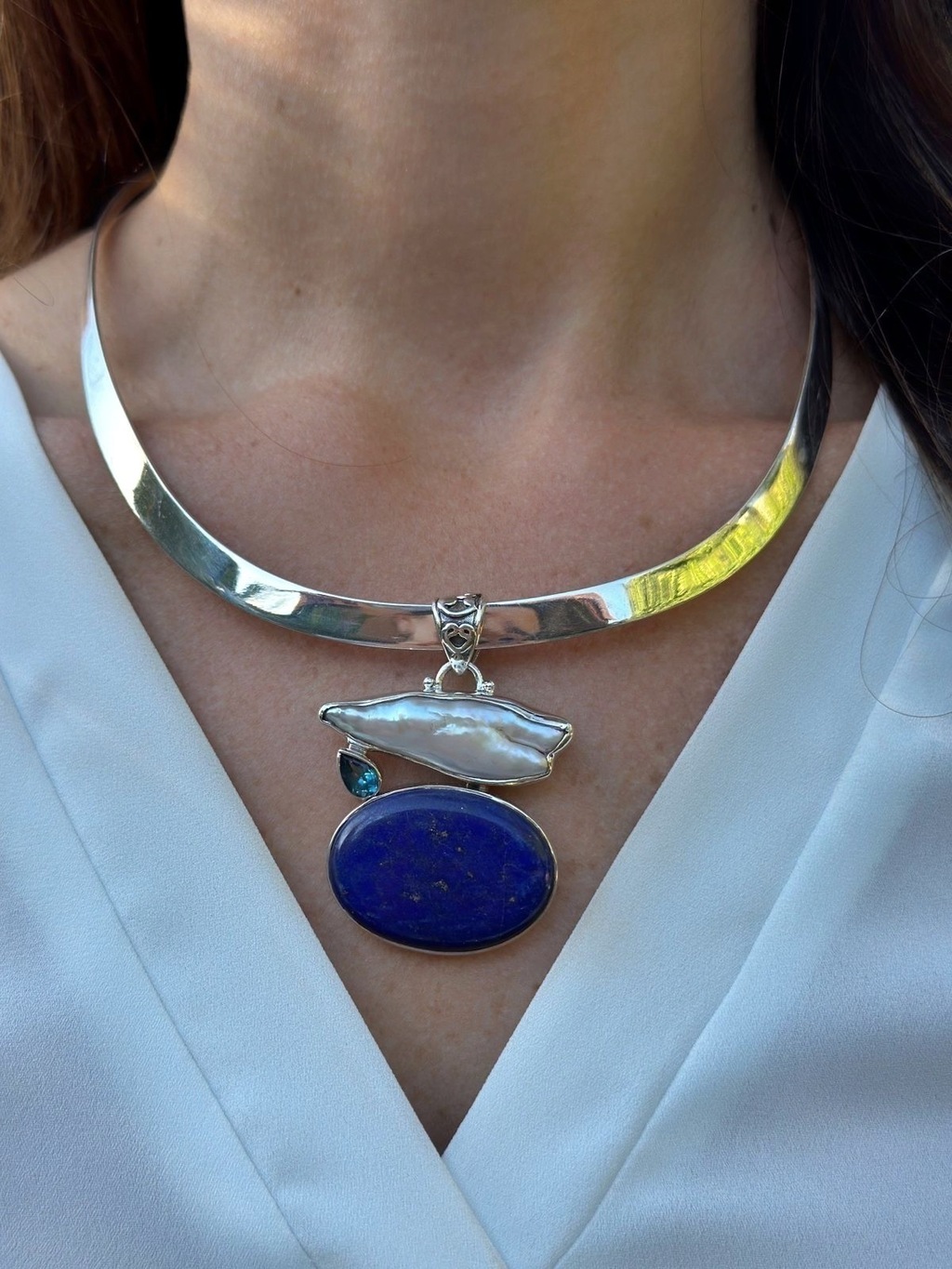 Pingente de pérola com lápis lazuli e detalhe em topazio azul, todo produzido na prata 925.