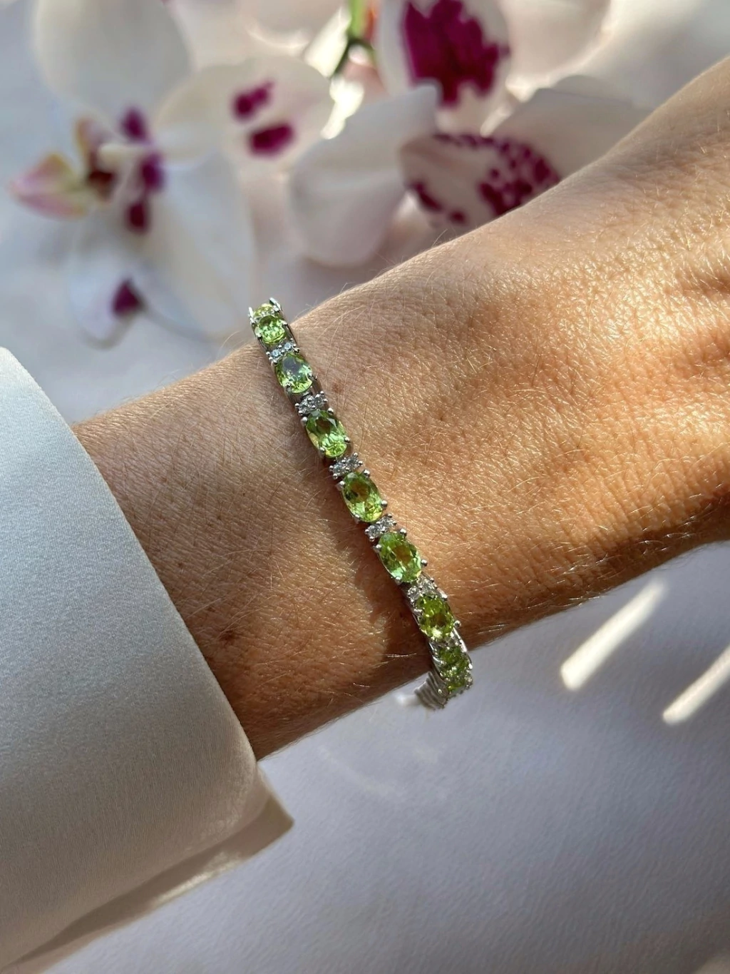Pulseira de peridoto lapidado com acabamento em prata + ródio com fecho de ajuste. 13 pedras de peridoto e entre cada pedra um detalhe de zirconia.